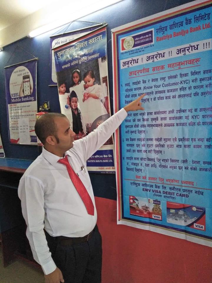 राष्ट्र बैकको निर्देशन अनुसार अाफ्नो बिबरण बुझाउनका लागि बैकले सबै संघसंस्था ग्राहकहरुलाई सुचना जारी गरेको र अहिले KYC अपडेट गराउनका लागि ग्राहकहरु बैकमा बिगत १ महिना देखि भिड लाग्ने गरेको कार्यालय कार्यलय प्रमुख न्यौपानेले जानकारी गराउनु भयो । उक्त फर्म भर्नका लागि बैकमा अाई सम्पर्क गर्न भन्दै सुचना जारी गरेको प्रबन्धक न्यौपाने बताउनु भयो ।