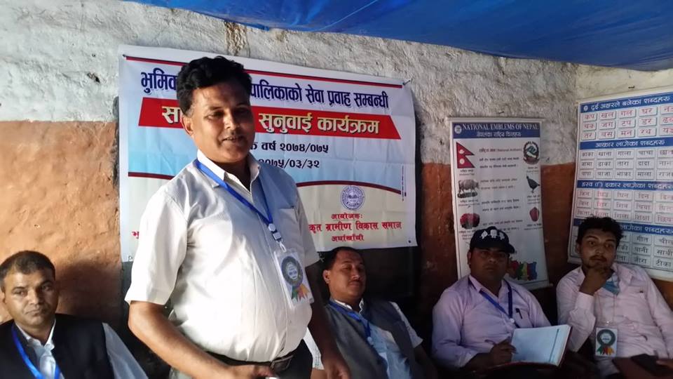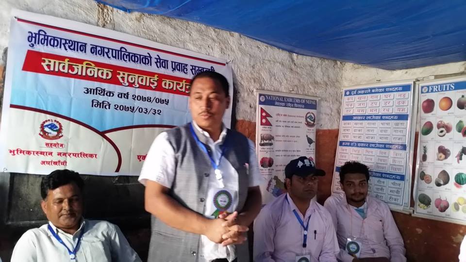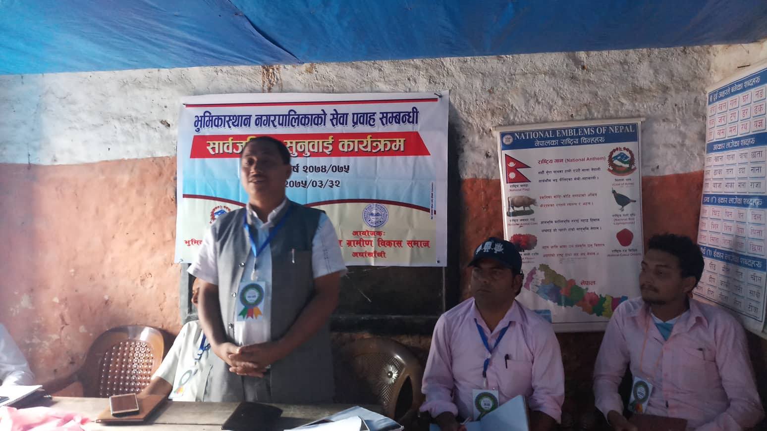 एकिकृत ग्रामीण विकास सस्थाको आयोजना र भुमिकास्थान नगरपालिकाको सहयोगमा सञ्चालन भुमिकास्थान नगरपालिकाको आर्थिक बर्ष २०७४, ७५ को सार्बजनिक सुनुवाइ कार्यक्रम सम्पन्न भएको हो ।
