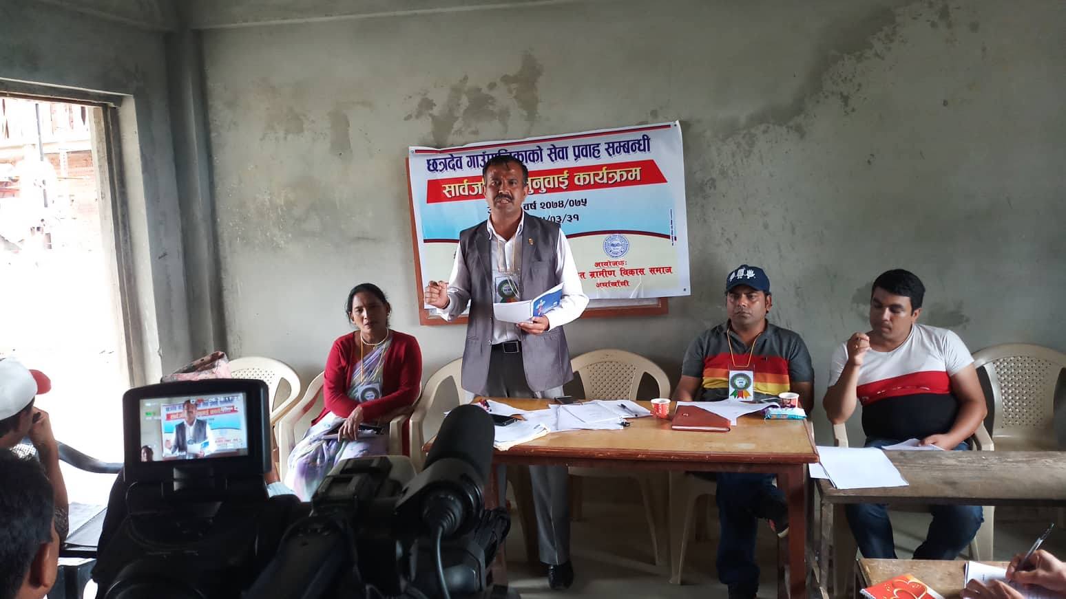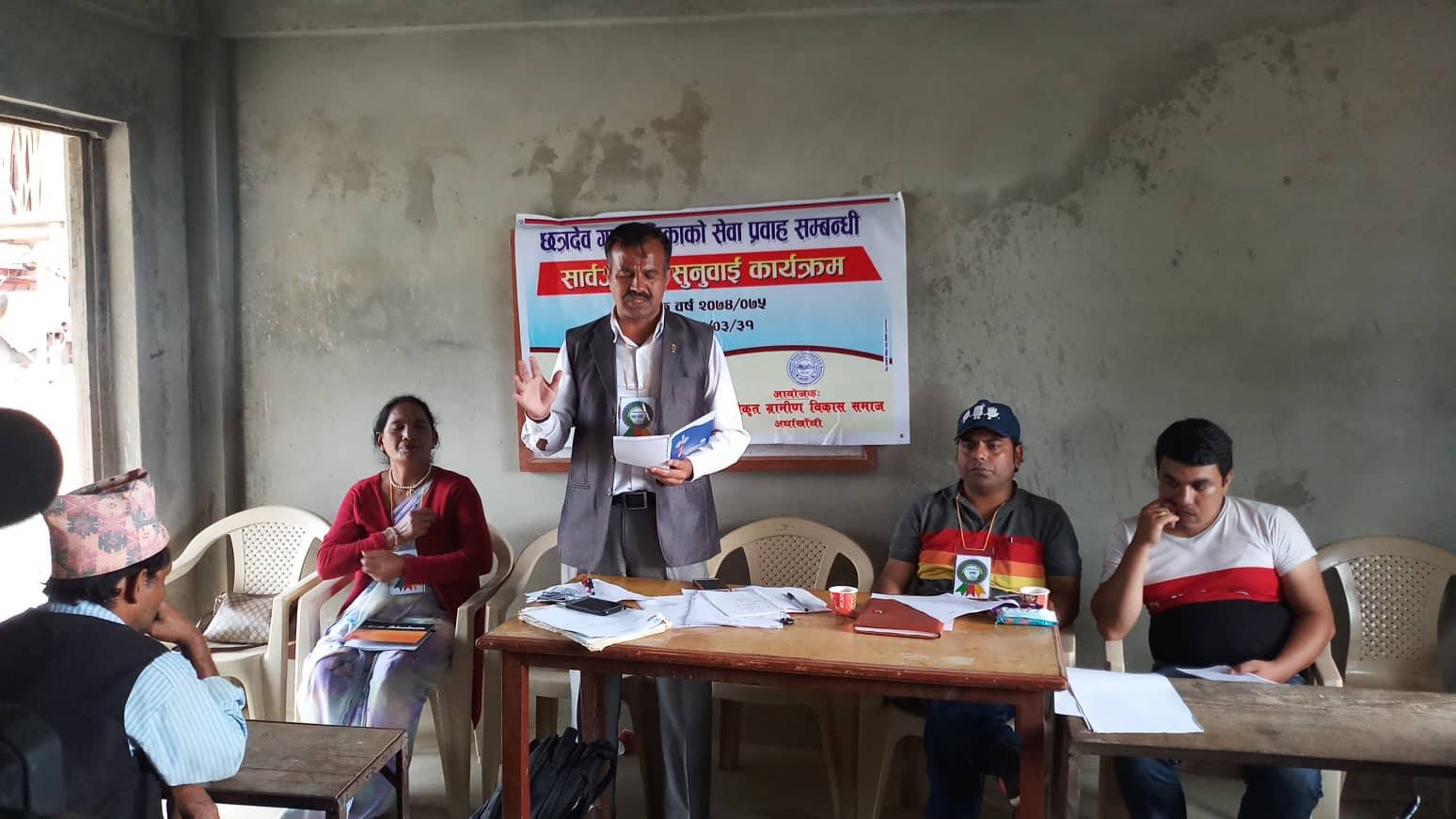 एकिकृत ग्रामीण विकास सस्थाको आयोजना र छत्रदेव गाँउपालिकाको सहयोगमा आर्थिक बर्ष २०७४, ७५ को सार्बजनिक सुनुवाइ कार्यक्रम सम्पन्न भएको हो ।