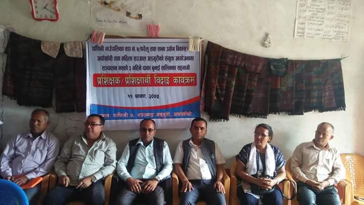 घरेलु तथा साना उधोग बिकास समिति अर्घाखाँची र महिला सन्जाल अडगुरीले अायोजना गरेको तिन महिने ढाका बुनाई तालिममा सहभागी प्रशिक्षक, प्रशिक्षार्थी बिदाई कार्यक्रममा बोल्दै पाणिनी गाउँपालिका अध्यक्ष अच्युत गौतमले अाफुले सिकेको सिपहरु व्यवहारमा लागु गरे बेरोजगारी समस्या समधान हुदै जाने बताउनु भएको छ । उहाले कृर्षि पसुपालन सिपमुलक तालिमहरुलाई गाउँपालिकाले अगाडि सारेको बताउदै हराभरा गाउँ बनाउने अभियानमा लाग्न अाग्रह गर्नु भएको हो ।