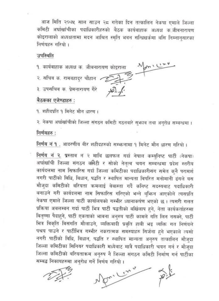 तत्कालिन नेकपा एमालेका कार्यवाहक अध्यक्ष जिबनारायण कोईरालाको अध्यक्षतामा साउन २८ गते बसेको बैठकले यस्तो निर्णय गरेको हो । यसरी आपत्ती जनाउनेहरुमा तत्कालिन नेकपा एमालेका कार्यवाहक जिल्ला अध्यक्ष जिवनारायण कोईराला, सचिव रामबहादुर चौहान र उपसचिव प्रेमनारायण गैरे रहेका छन ।