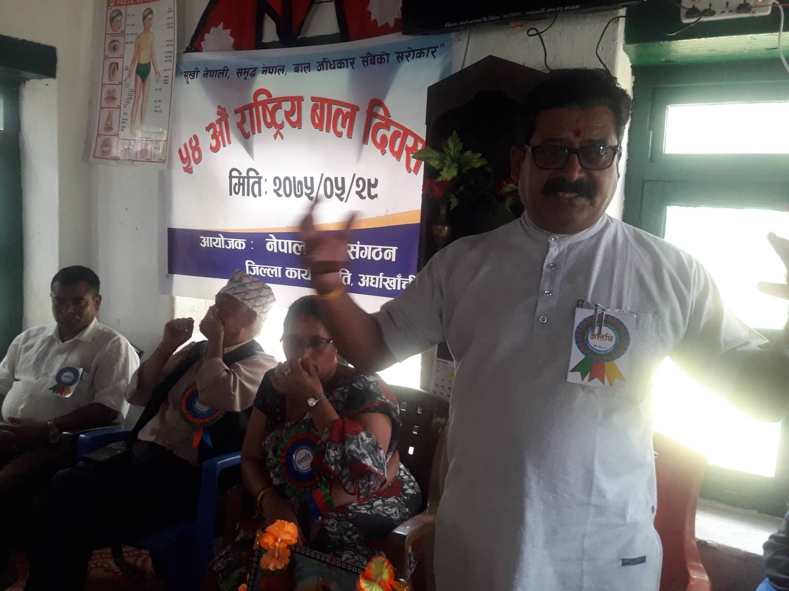 जिल्ला बाल संघगठन अर्घाखाँचीको अायोजनामा गरिएको कार्यक्रममा जिल्ला समन्वय समितिका प्रमुख पिताम्बर शर्मा नगरप्रमुख कमल प्रसाद भुसाल उपप्रमुख ठाकुर कुमार बिक प्रमुख जिल्ला अधिकारी खिमराज भुसाल जिल्ला समन्वय अधिकारी कृस्न प्रसाद पान्डे प्रहरी नायब उपरीक्षक नबराज मल्ल ससत्र प्रहरि प्रमुख गोपाल श्रेष्ठ सनपा बारणड नम्बर १ का वार्ड अध्यक्ष युवराज बन्जाडे ३ का अध्यक्ष लिला राम गौतम नेपाल चेम्बर अफ कमर्सका अध्यक्ष असोक कुमार श्रेष्ठ पत्रकार माहासघ का अध्यक्ष हिम जिसि लेकालि निर्माण ब्यबसायी संघका काबा अध्यक्ष काशी बस्याल लगाएतले मन्तब्य राखेका थिए ।