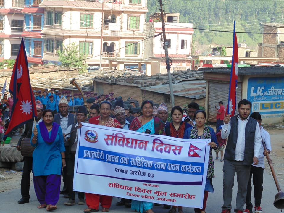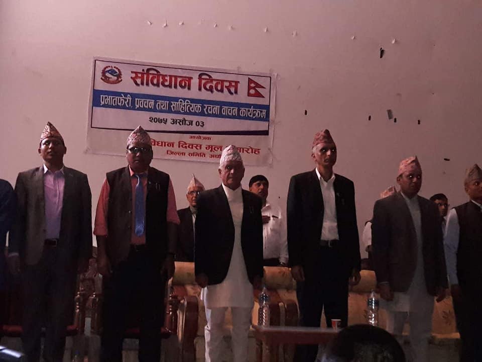 यसैबिच बुधबार अर्घाखाँचीको सदरमुकाम सन्धिखर्कमा पनि संबिधान दिबसको अबसरमा प्रभातफेरी तथा प्रबचन कार्यक्रम सम्पन्न भएको छ । संबिधान दिबस जिल्ला समारोह समितिको आयोजनामा बिहान सन्धिखर्कमा बाजागाजा सहित प्रभातफरी गरी जिबिसको सभाहलमा प्रबचन कार्यक्रम तथा कबिता बाचन कार्यक्रम सम्पन्न भएको हो ।