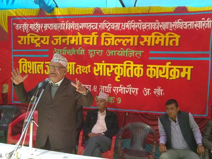कर बृद्धि,महगीं र भ्रष्टचारको बिरोध,गणतन्त्र,राष्ट्रियता,धर्म निरपेक्षताको रक्षा र संघियताको खारेजी भन्ने मुल नाराका साथ ऐतिहांसिक स्थल अर्घाको रानीगैरामा आयोजित बिशाल जनसभालाई उद्घाटन गर्दै अध्यक्ष के.सी.ले नेपालको तराई क्षेत्रको भु–भाग भारतले आफ्नो कब्जामा पार्ने रणनीति संघियताबाटै सम्भव रहेको र यसको ज्वलन्त उदाहरण पाँच नं प्रदेशलाई तराईबाट छुट्टाउने खेल भएको बताउनुभएको छ ।