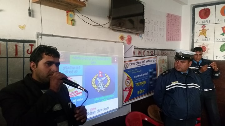 ग्रीन बोर्डिंगमा अध्यनरत कक्षा ७ देखि १० सम्मका विद्यार्थीहरुलाइ सडक पार गर्ने तरिका, सडक बत्ती, दुर्घटना न्युनीकरणका उपाय तथा समग्र ट्राफीक नियमका बारेमा सचेतनामुलक कार्यक्रम सम्पन्न गरिएको हो ।