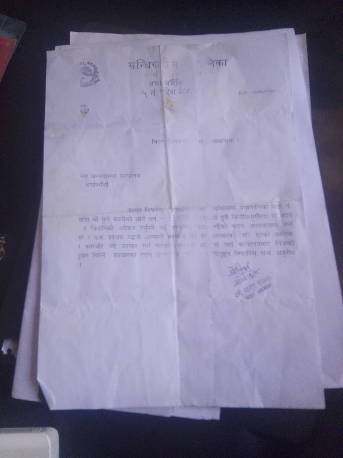 अर्घाकी दुवै मिर्गौला पीडित १६ वर्षिया किशोरी संगिता बिकको पारिवारिक आर्थिक अवस्था कमजोर भएको उपचारको लागि समस्या परेको हो ।