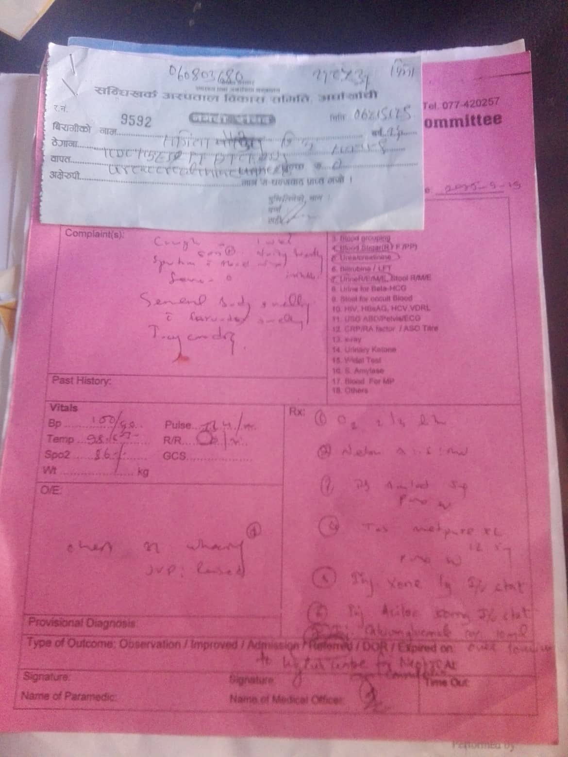 सन्धिखर्क स्थित जिल्ला अस्पतालमा भर्ना भएकी संगिता बिकलाई बुटवलको गौतम बुद्द अस्पतालमा रिफर गरिएको छ । यस अघि उनिलाई पाटन अस्पताल र बुटवलमा लागि उपचार गरिएता पनि आर्थिक अवस्था कमजोर भएको कारण जिल्ला फर्काइएको थियो ।