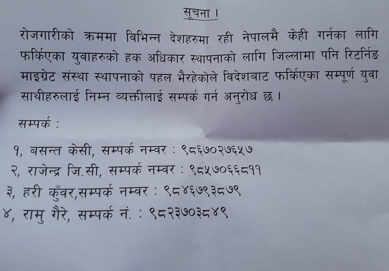 रिटर्नी माइग्रेन्ट नेपालका अध्यक्ष उत्तम अधिकारीको भनाइ रहेको थियो । स्वदेश फर्केकाको सीप, अनुभव र पुँजीलाई राज्यको समृद्धि प्राप्ति र स्वयं व्यक्तिको आर्थिक विकासमा टेवा पुयाउन संस्थामार्फत्सङ्गठित भइरहेको रिटर्नी माइग्रेन्ट नेपालका अध्यक्ष उत्तम अधिकारीले जानकारी गराए ।