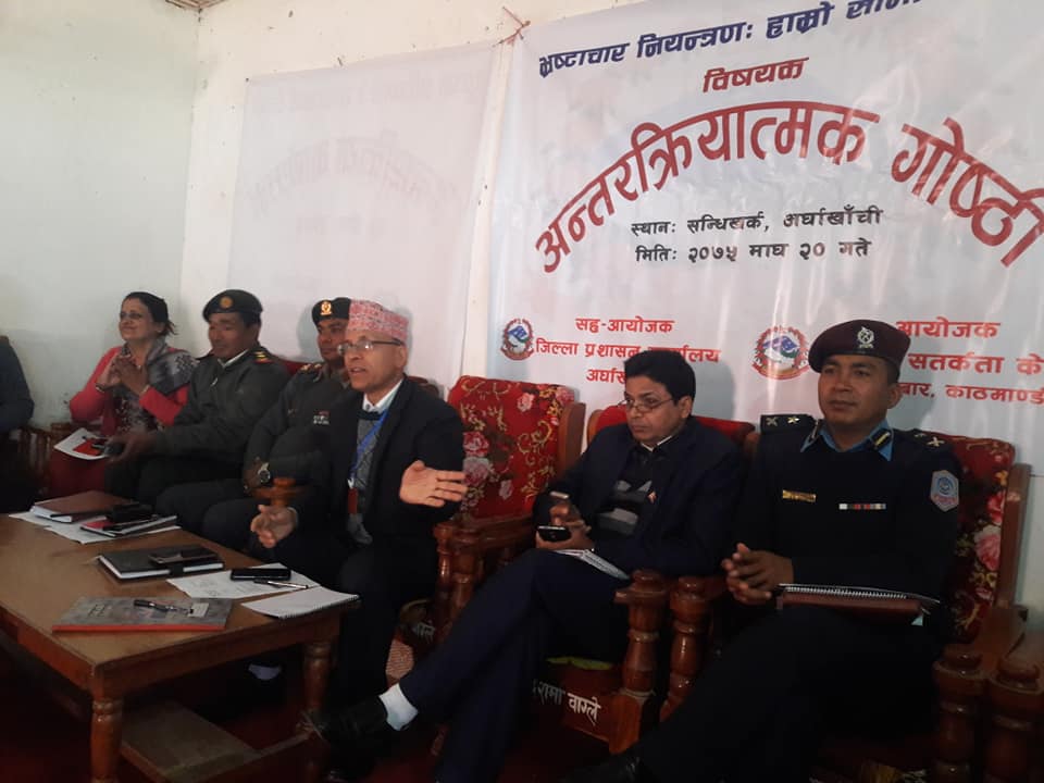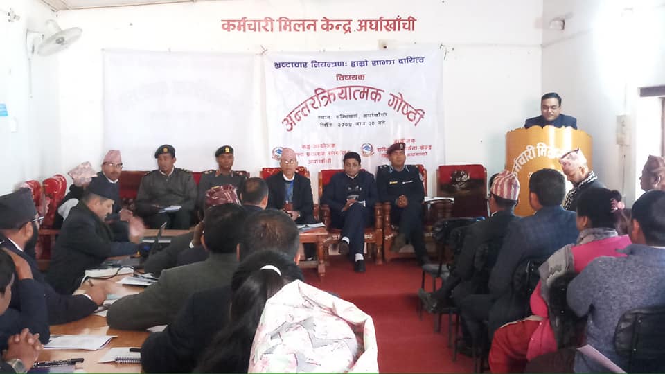 राष्ट्रिय सतर्कता केन्द्रकाे आयाेजना र जिल्ला प्रशासन कार्यलय अर्घाखाँचीकाे सह-आयाेजनामा अन्तरक्रिया कार्यक्रम सम्पन्न भएको हो ।