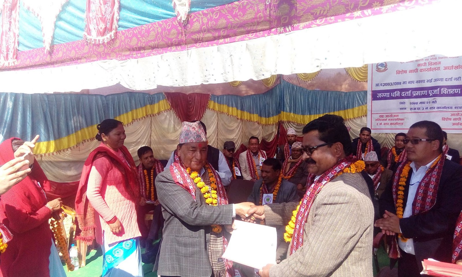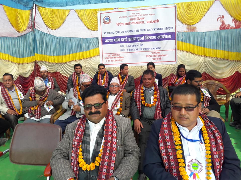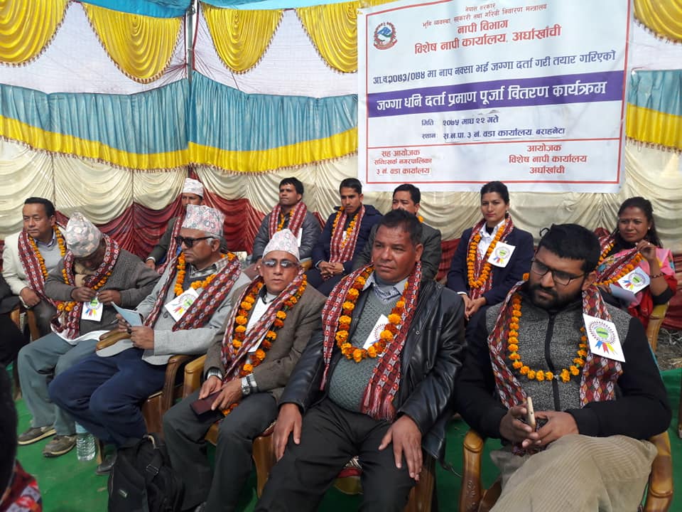 विशेष नापी कार्यालय अर्घाखाँचीले नापजाचँ गरी तयार गरेका लालपुर्जा आज एक कार्यक्रमका बिच सन्धिखर्क नगरपालिकाका प्रमुख कमलप्रसाद भुसालले वितरण गरेका थिए । १६ वर्षपछि  ८२ वर्षिय टानबहादुर खड्का, ८६ वर्षिय मेयरसिंह खड्काले लालपुर्जा वितरण पाएपछि खुसी व्यक्त गरेका थिए । वि.स. २०५९ सालदेखि लालपुर्जा नभएर खड्काले बैँकबाट जग्गा धितोमा राखेर ऋण निकाल्न समेत नपाएको बताए । ।