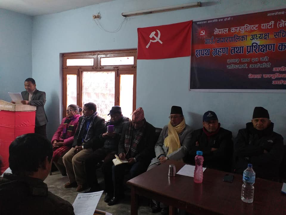 नेपाल कम्युनिष्ट पार्टी नेकपाका छ ओटै स्थानीय तहका अध्यक्ष र सचिवहरुले सपथ लिएका छन् । नेकपाको सन्धिखर्क नगरपालिकाको अध्यक्षमा श्रीकृष्ण भुसाल सचिवमा शिव अधिकारी, भुमिकास्थानको अध्यक्षमा राजेन्द्र आचार्य, सचिवमा मणि पौडेल, सितगंगाको अध्यक्षमा वसन्त श्रेष्ठ सचिवमा मणिराम अधिकारी चयन हुनु भएको छ ।