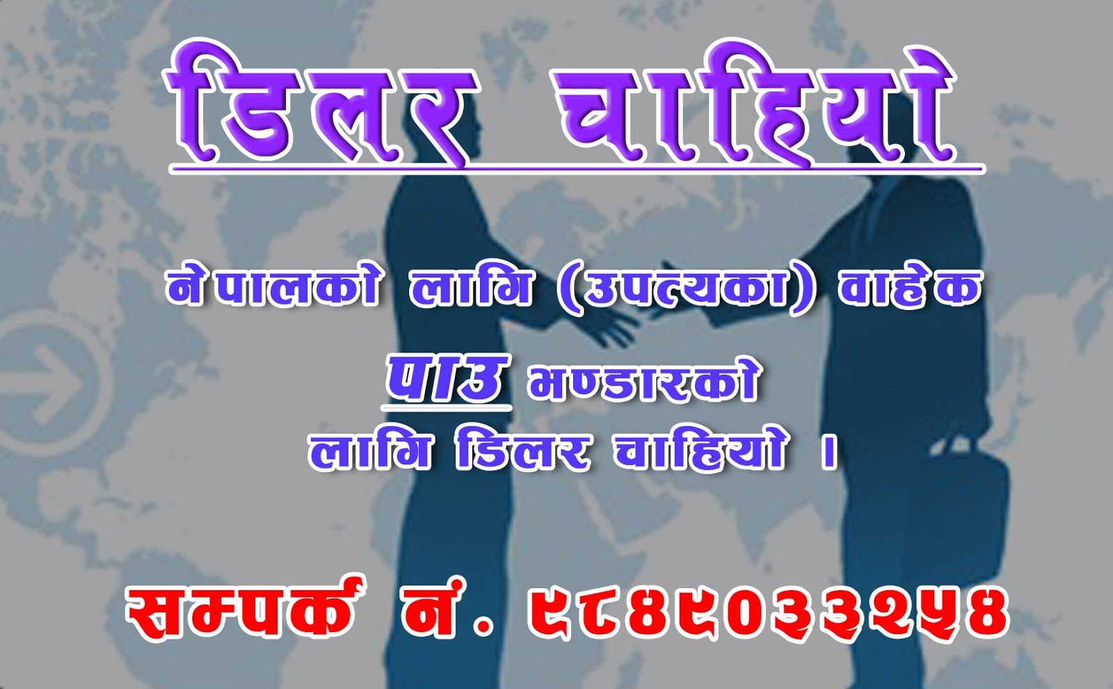 काठमाडौं स्थित एक प्रतिष्ठित एक पाउ भण्डारको लागी उपत्यका बाहिर तुरुन्तै डिलरको आबस्यकता परेको हुनाले इच्छुक तथा सो डिलर समन्धि कार्य गर्न चाहाना भएको ब्यक्तीले तुरुन्तै सम्पर्क गर्नु होला।