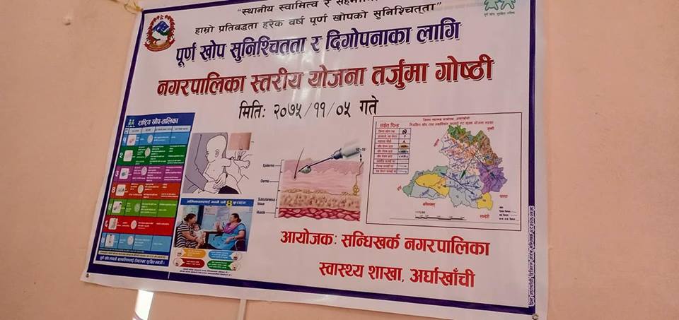 सन्धिखर्क नगरपालिकाको स्वास्थ्य शाखाको आयोजनामा भएको कार्यक्रममा सन्धिखर्क नगरपालिकाका वडा अध्यक्ष, स्वास्थ्य सस्थाका प्रमुख र सरोकारवालाहरुको सहभागिता रहेको थियो । सन्धिखर्क नगरपालिका भित्रका वालवालिकाको खोपको अबस्थाको बारेमा छलफल गरिएको थियो ।