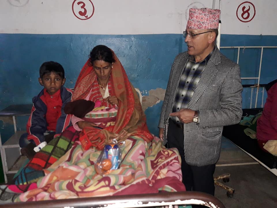 जिल्ला समन्वय समिति अर्घाखाँची का प्रमुख पिताम्बर शर्मा उप प्रमुख ऋषि पुलामी प्रमुख जिल्ला अधिकारी प्रेम लाल लामिछाने प्रहरी नायब उपरीक्षक नबराज मल्ल उद्योग बाणिज्य महासङ का केन्द्रिय सदस्य कृष्ण प्रसाद श्रेष्ठ जिल्ला अध्यक्ष युबाराज श्रेष्ठ नेकपा कि महिला नेतृ छम कुमारी खनाल राजनैतिक दलका प्रतिनिधि जिल्ला अस्पतालका स्वास्थ कर्मी लगायतले अस्पताल मा रहेक करिब १७ जना बिरामी हरु लाई स्वास्थ लाभ को कामना गर्दै होर्लेक्स तथा फलफूल बितरण गरिएको थियो जस्को प्रायोजन उद्योग बाणिज्य संघ अर्घाखाँचीले गरेको थियोे ।