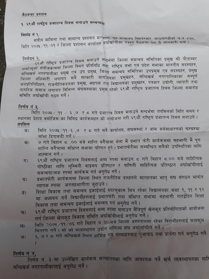 जिल्ला मा प्रजातन्त्र दिबसको अबसर मा तीन दिन सम्म विभिन्न कार्यक्रम रहेको आयोजकले जनाएको छ।