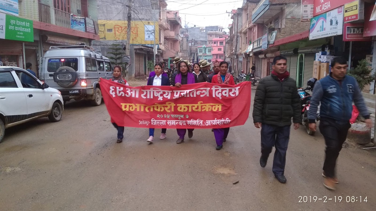 सन्धिखर्क, अर्घाखाँची । अर्घाखाँची जिल्लाको सन्धिखर्कमा ६९ औ राष्ट्रिय प्रजातन्त्र दिबसको अबसरमा जिल्ला मुल समारोह समिति अर्घाखाँचीको आयोजनामा भएको विशाल प्रभातफेरी -याली तथा सभा सम्पन्न भएको छ ।