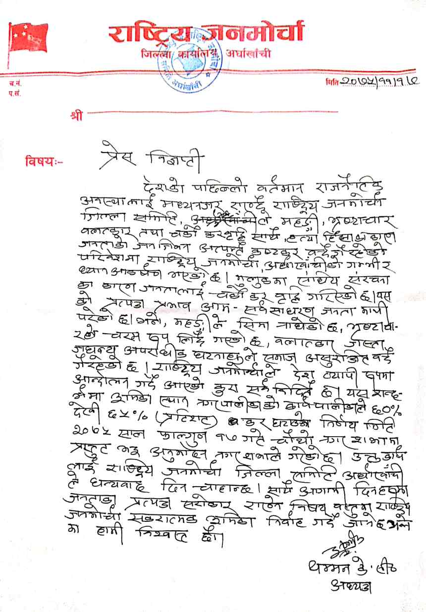 यस्तै राजमोले आगामी दिनमा जनतासंग प्रत्यक्ष सरोकार राख्ने बिषयमा सकारात्मक भुमिका निर्वाह गर्नेसमेत बिज्ञप्तीमा उल्लेख गरीएको छ ।