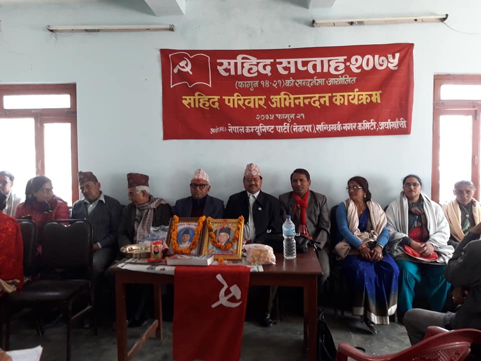 सन्धिखर्कमा नेपाल कम्युनिस्ट पार्टी (नेकपा ) नगर कमिटीको सहिद परिबारलाई अभिनन्दन कार्यक्रम सम्पन्न (तस्बिर सहित)