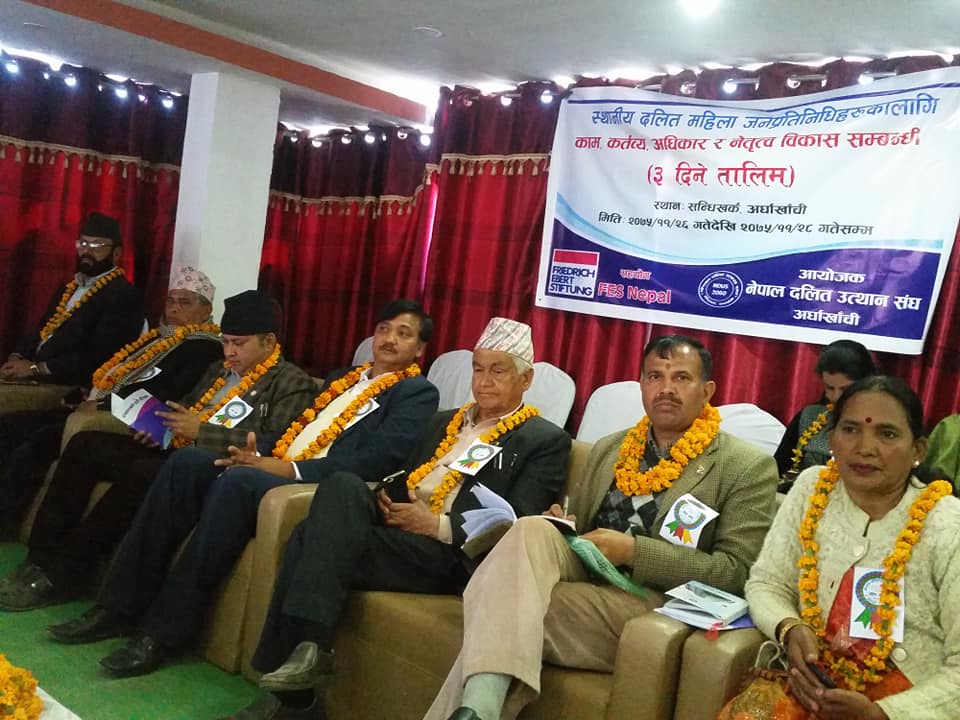 तालिममा सन्धिखर्क नगरपालिका, छत्रदेव गाँउ पालिका र मालारानी गाँउपालिकाका दलित महिला जन प्रतिनिधिहरुको सहभागीता रहेको छ ।