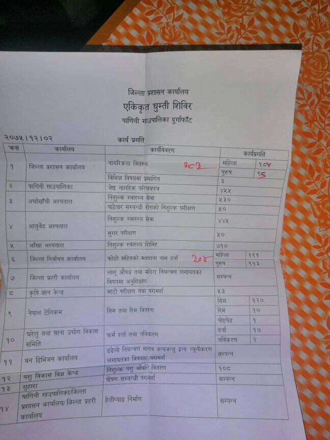 शिविरमा उद्योग फर्म दर्ता तथा नवीकरण, नागरिकता वितरण, फोटोसहितको मतदाता नामावली संकलन, ज्येष्ठ नागरिक परिचय पत्र वितरण, सार्वजनिक सुनुवाई, निःशुल्क स्वास्थ्य शिविर, पशुसेवासम्बन्धी कार्यक्रम, समुदाय प्रहरी साझेदारी कार्यक्रम, मानव वन्यजन्तु द्वन्द्व न्यूनीकरण सचेतना कार्यक्रम, माटो किरा तथा रोग परीक्षण लगायतका सेवा प्रदान गरिएको थियो ।