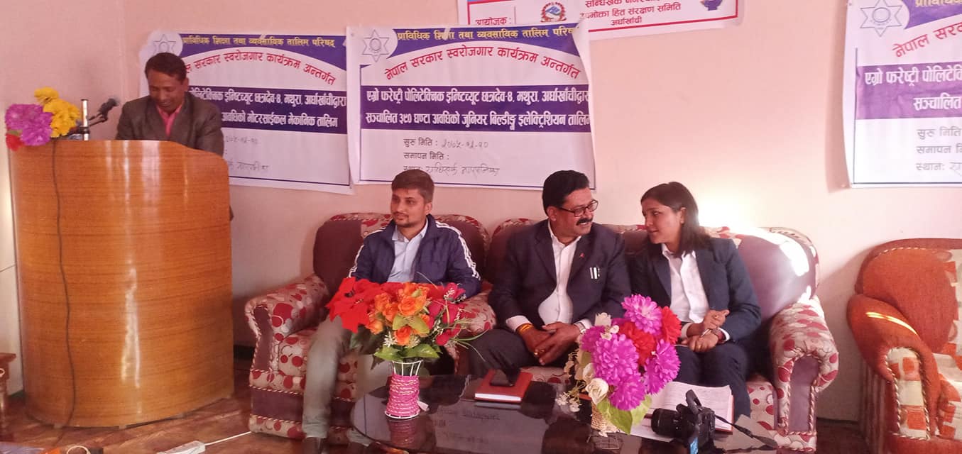 सन्धिखर्क, अर्घाखाँची (अर्घाखाँचीडट्कम) । अर्घाखाँची जिल्लाको सन्धिखर्कमा एग्राे फरेष्टी पाेलिटेक्निक इन्ष्टिच्युट मथुराकाे आयाेजनामा ३९० घण्टे माेटरसाइकल मेकानिक, इलेक्टिसियन र प्लम्बिङ तालिम शुरु भएको छ ।