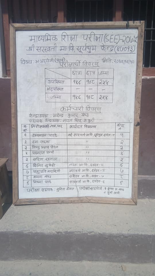 यस्तै एक्जाम्टेड ग्रेडबृद्धि तर्फ १ मात्र परीक्षा केन्द्र श्री गंगा आधारभुत विद्यालय सन्धिखर्कमा रहेको छ । गंगा आधारभुत विद्यालयमा १८ जना परिक्षार्थी अनुपस्थित रहेका छन् । जसमा १ सय जना छात्र र २३ जना छात्रा गरी जम्मा १२३ जना परीक्षार्थीहरु परीक्षामा सहभागी हुदैछन । यस्तै प्राविधिक बिषयतर्फ ४९ परीक्षार्थीले एसईई परिक्षा दिदै छन । परीक्षामा १ जना परीक्षार्थी पुर्णदृष्टीबिहिन रहेको छन् ।