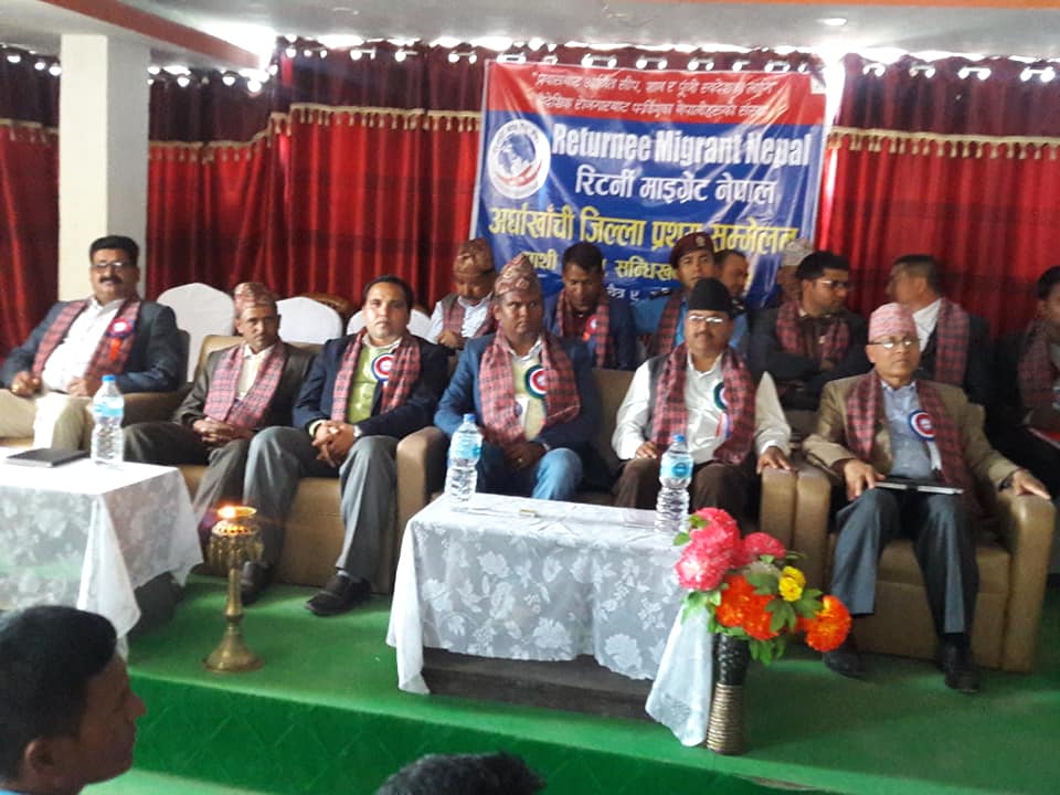 रिटर्नी माइगं्रेट नेपालका केन्द्रिय अध्यक्ष उत्तम अधिकारीले आफुहरु राज्यको निति र कार्यक्रम संग, संगै हिड्न चाहेको बताउनु भयो । अधिकारीले वैदेशिक रोजगारमा रहदा राज्यको निम्ती पु¥याएको योगदानको घर फर्किदा कदर नभएको भन्दै चिन्ता समेत व्यक्त गर्नुभयो । राज्यले लिएको आर्थिक समृद्धिको नारालाई सार्थक पार्न रिटर्नीहरुको सिप र क्षमतालाई परिचालन गर्नुपर्नेमा अधिकारीले जोड दिनुभयो । सम्मेलन आयोजक समितिका संयोजक बसन्त केसीको अध्यक्षता,रामप्रसाद गैरेको स्वागत मनतब्य र राजेन्द्र जिसीको सन्चालनमा सम्पन्न कार्यक्रममा सन्धिखर्क नगरपालीका प्रमुख कमल प्रसाद भुसाल, उपप्रमुख ठाकुर कुमार विक, मालारानी गाउँपालीका उपाध्यक्ष प्रमिला क्षेत्री, प्रमुख जिल्ला अधिकारी प्रेमलाल लामिछाने, राजमो प्रतिनिधि यमलाल पोख्रेल, संघिय समाजबादी फोरमका नेत्र बहादुर थापा मगर, नयाँशक्ति पार्टीका पुष्करनाथ आचार्य, बिबेकशिल साझा पार्टीका हरी प्रसाद भुसाल, अर्घाखाँची उद्योग बाणीज्य संघका अध्यक्ष युबराज श्रेष्ठ, नेपाल चेम्बर अफ कर्मशका अध्यक्ष अशोक कुमार श्रेष्ठ, पत्रकार महासंघका अध्यक्ष हिम जिसी लेकाली लगायतले मन्तव्य राख्दै सबै युबाहरुलाई देश बिकासमा लाग्न आग्रह गर्नु भएको थियो ।