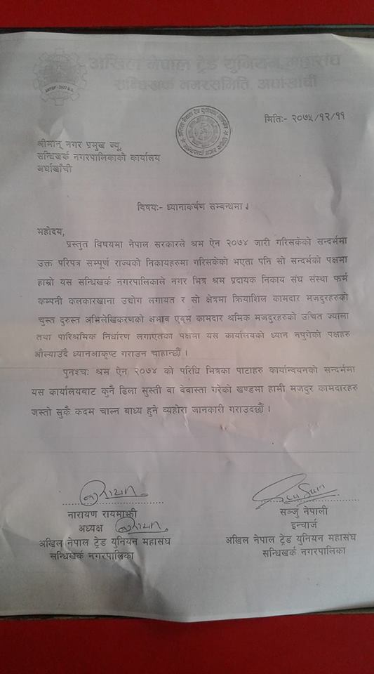 सन्धिखर्क चैत्र १२, अर्घाखाँची – हिजो एक कार्यक्रमका बीच अखिल नेपाल ट्रेडयुनियन महासंघले नेपाल सरकारले पारित गरेको २०७४ मजदुर ऎन यथासिघ्र लागु गर्नु पर्ने भन्दै सन्धिखर्क नगरकार्यापालिकाका मेयर कमल प्रसाद भुसाल र उपमेयर ठाकुर कुमार बि .क (किशोर )लाई ज्ञापन पत्र बुझाएको छ।