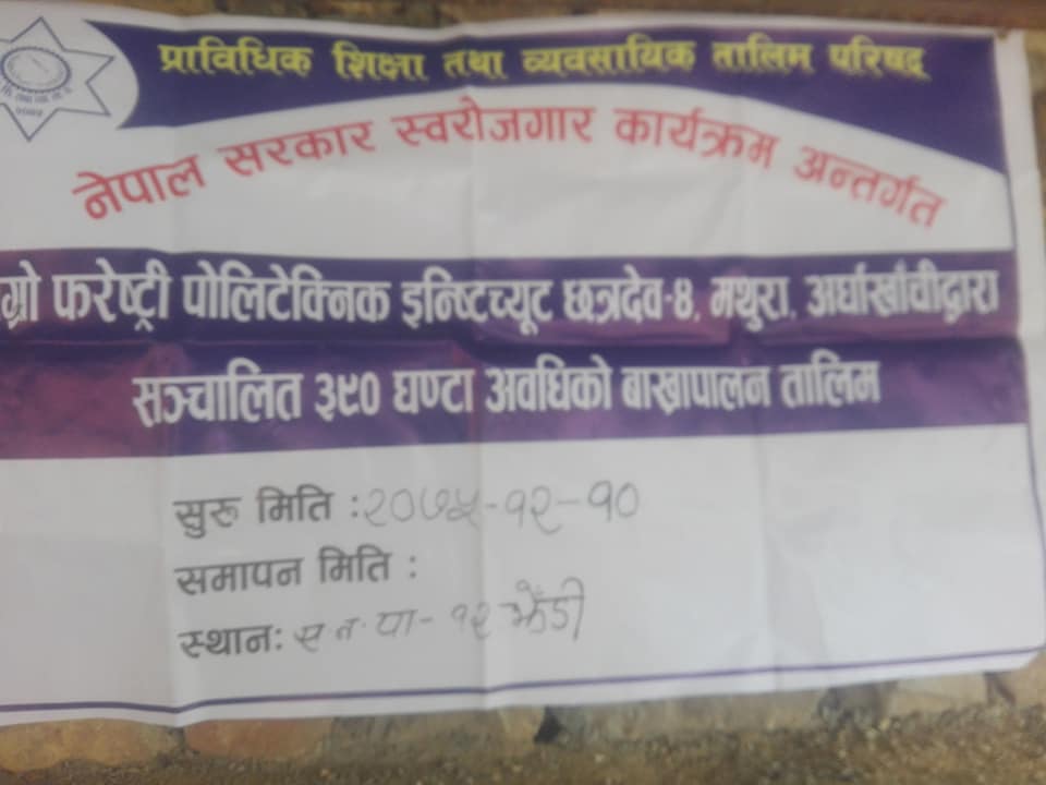 मथुराको एग्रोफरेस्टि पोलिटेक्निक ईन्स्टिच्युटको आयोजनामा ३९० घण्टा अवधि बाख्रा पालन तालीम शुरु भएको हो ।