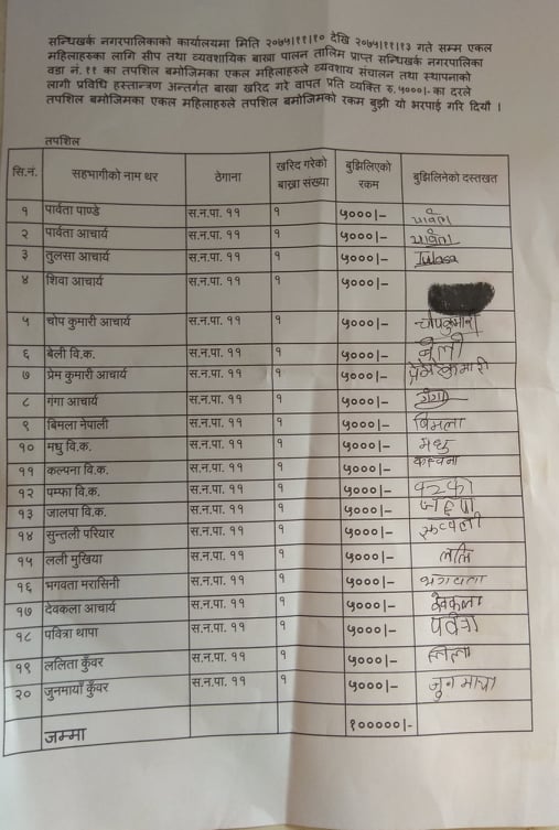 वडाका २० जना एकल महिलाहरुलाई प्रति ब्यक्ती पाँच हजार रुपैयाका दरले जम्मा रु १ लाख रुपैया हस्तान्तरण गरीएको हो । यसअघि एकल महिलाहरुले नगरपालीकाले आयोजना गरेको ४ दिने बाख्रापालन व्यवसायीक तथा उद्योमसिलता तालीम समेत लिनुभएको थियो । रकम प्राप्त गरेपछी स्थानिय एकल महिलाहरुले बाख्रालाई माईति घरबाट लिएको चिनो भन्दा पनी मायाँ गरी पालनपोषण गर्ने बताउनु भयो ।