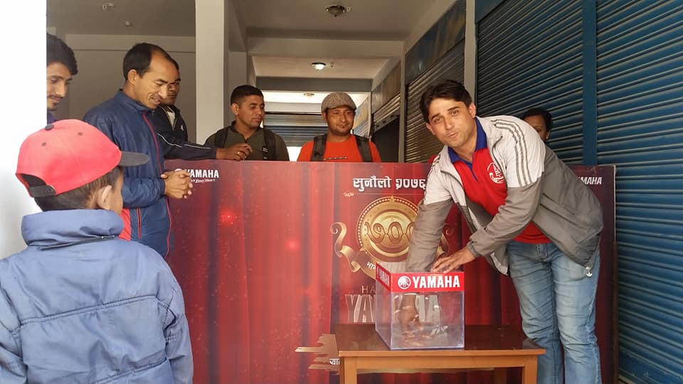 नव दुर्गा माेटर साईकल वर्क शप सन्धिखर्कका प्राेपराईटर राम चन्द्र घिमिरेका अनुसार नयाँ यमहा माेटरसाईकल किन्ने ग्राहक मध्ये एकले पाँच ग्राम सुनकाे सिक्का जितेको र आगामी प्रत्येक हप्ता यमहा अफर राखिने बताए ।   लक्की ड्र कार्यक्रम पत्रकार देवेन्द्र कुवरको सञ्चालनमा सम्पन्न भएको थियो ।