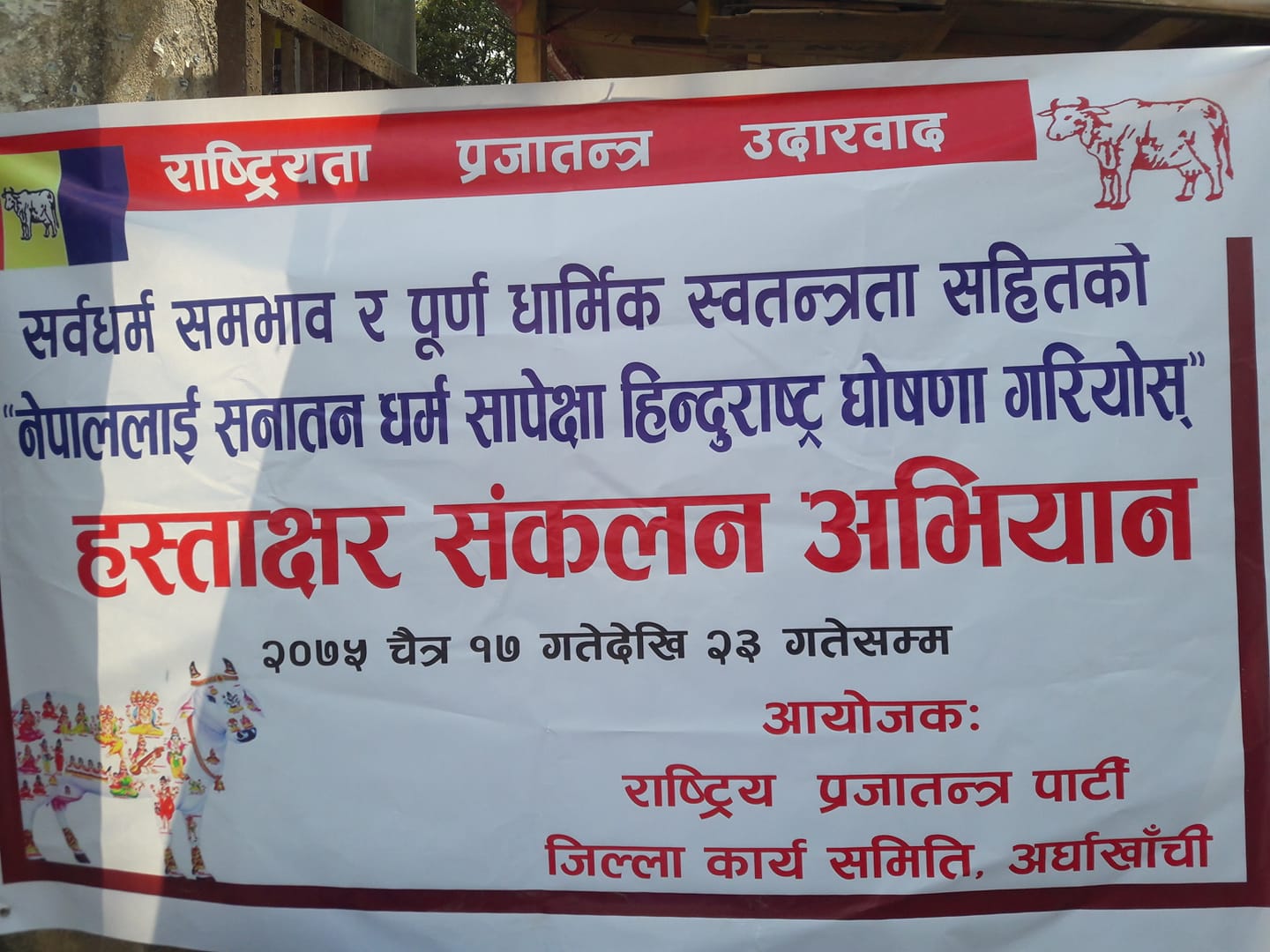 सन्धिखर्क, अर्घाखाँची । अर्घाखाँची जिल्लाको सन्धिखर्कमा हिन्दु राज्यकाे माग गर्दै राष्ट्रिय प्रजातन्त्र पार्टी अर्घाखाँचीले हस्ताक्षर संकलन अभियान शुरु गरेको छ ।