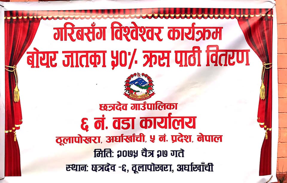 गरिब सँग विश्वेश्वर कार्यक्रमकाे पुँजिगत बजेटबाट उक्त समुहका विपन्न सदस्यहरूलाई बाेयर क्रस जातका पाठी वितरण कार्य सम्पन्न भएकाे हो