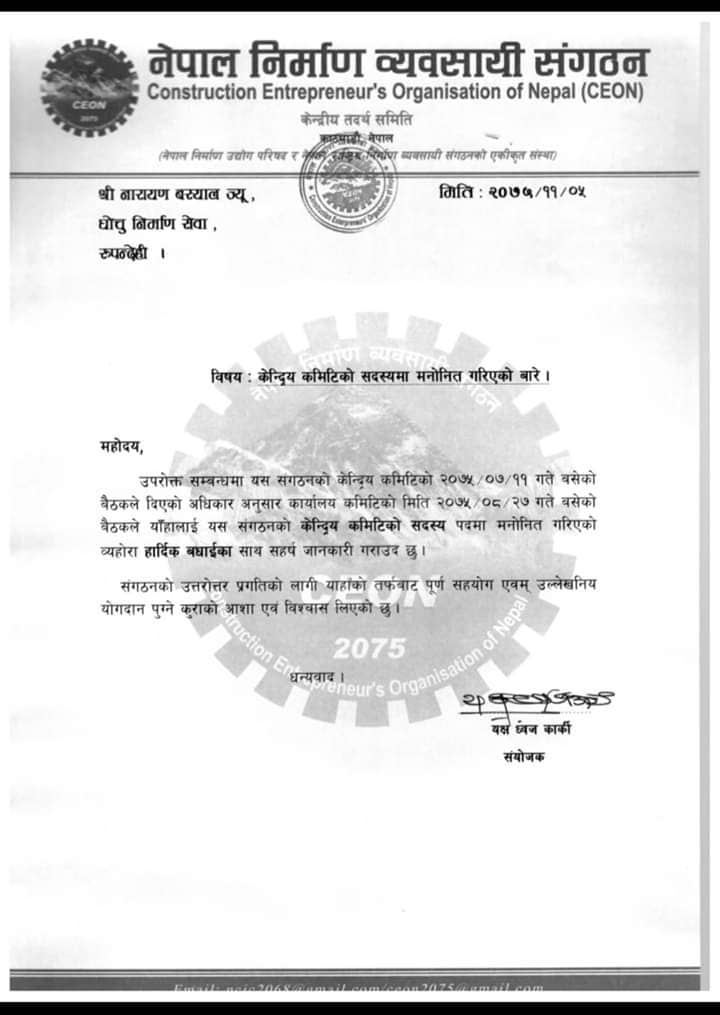 सन्धिखर्क, अर्घाखाँची। अर्घाखाँची जिल्ला सन्धिखर्क नगरपालिका वार्ड नम्वर २२ निबासी नारायण बस्याल नेपाल निर्माण ब्यबसायी संगठनको केन्द्रीय सदस्यमा मनोनित भएका छन ।