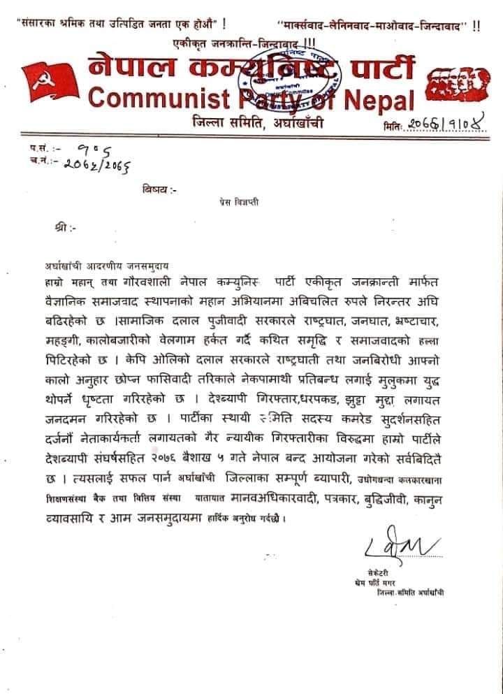 बुधवार नेपाल कम्युनिष्ट पार्टी अर्घाखाँचीका जिल्ला सेक्रेटरी खिम घर्तीले निकालेको एक विज्ञप्ती अनुसार आफ्ना नेता-कार्यकर्ताहरुमाथि बिनाकारण दमन, प्रकाउ गरेको भन्दै नेकपाले त्यसको विरोधमा बैशाख ५ गते नेपाल बन्दको आव्हान गरेको बताएको छ ।