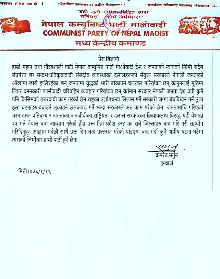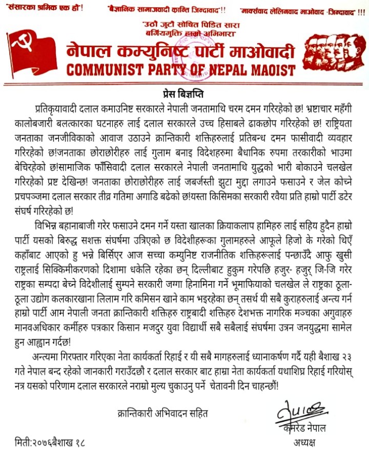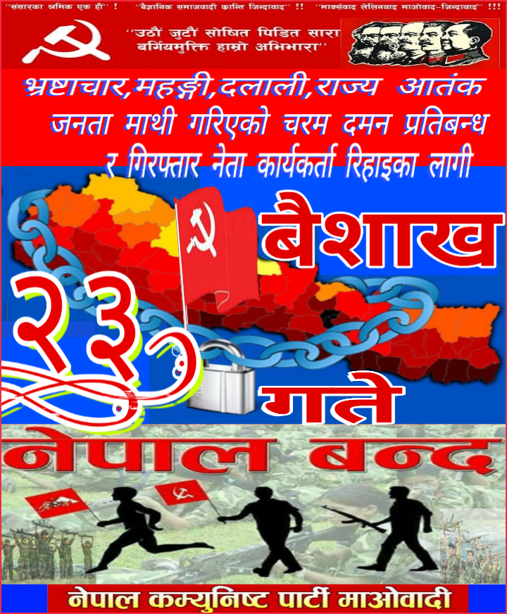 कानुनलाई मुठिमा लिएर दमनकारी फाँसीवादी चरित्रहिन व्यवहार गरिरहेका छन् । जनतमाथि गरिएको चरम दमन, प्रतिबन्ध र जनताका जनजीवीका राष्ट्रियता र दलाल सरकार क्रियाकलापविरुद्ध वैशाख २३ गते नेपाल बन्दको आह्वान गरेको हुँदा उक्त दिन प्रदेश ३ र ४ का सबै जिल्लाहरु बन्द गरी सहयोग गरिदिन आह्वान छ ।