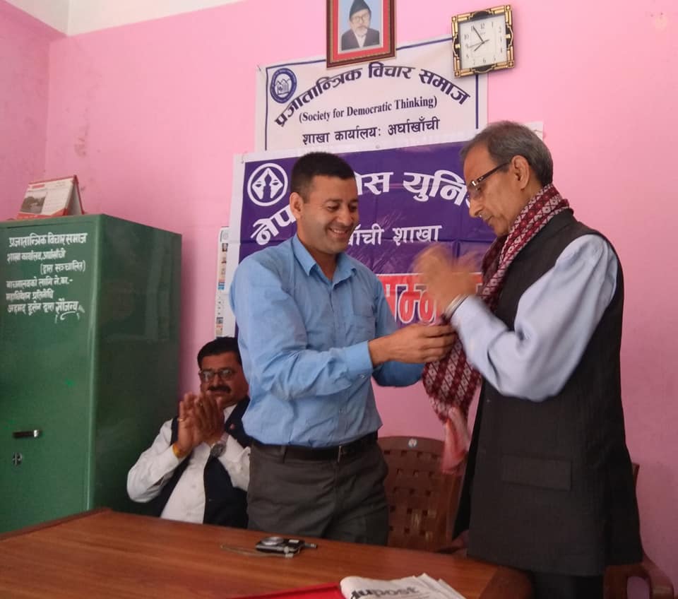 नेता रेवती प्रसाद भुसालको प्रमुख अतिथ्यता पार्टीका पुर्व सभापति तथा सन्धिखर्क नगरपालिकाका नगरप्रमुख कमल प्रसाद भुसाल उपसभापति शान्ता भन्डारी क्षेत्रीय सभापति केशब कुवर महासमिति सदस्य केसब श्रेष्ठ माहाधिबेसन प्रतिनिधि कृष्ण खनाल नेपाल पत्रकार महासंघका संस्थापक सभापति बिस्नु प्रसाद भुसाल लगायतका अतिथिहरुको सहभागीतामा कार्यक्रम सम्पन्न भएको हो । कार्यक्रम जिल्ला सभापति बिरेन्द्र केसीको अध्यक्षता, उपाध्यक्ष सरिता भुसालको स्वागत मन्तब्य सचिब बिस्नु खनालको सन्चालनमा सम्पन्न भएको थियो ।