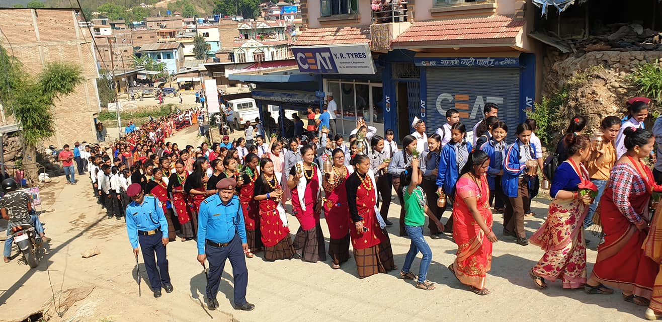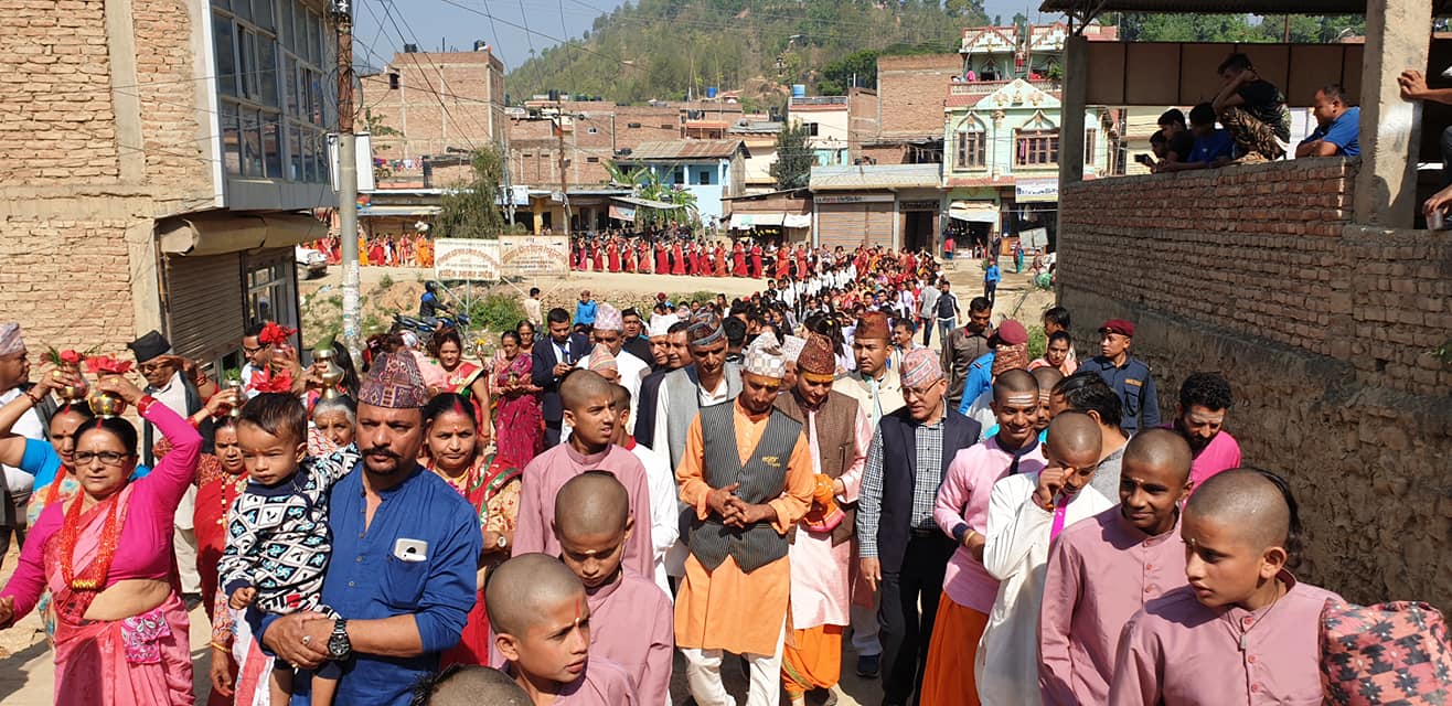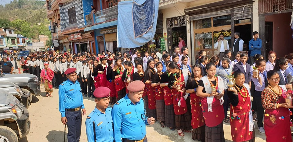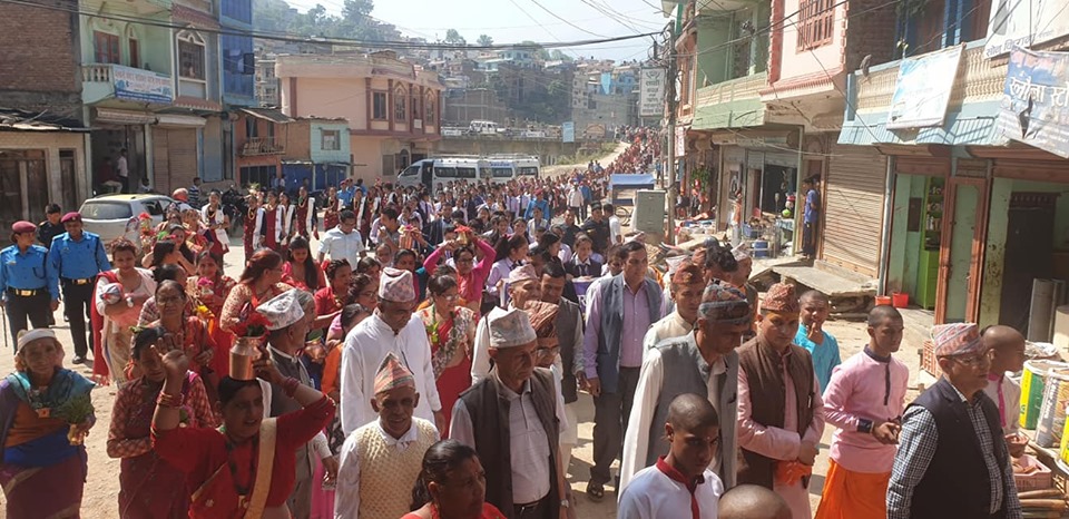भक्ति टोलाको श्री सिद्धेशवर शक्तिश्वर शक्तिपिठ प्रङागणबाट बिहान ८ बजे कलश यात्रामा जय जय कार सहित बजार परिक्रमा गरि पाठपुजा हरुको शुरूवात गरिएको छ।