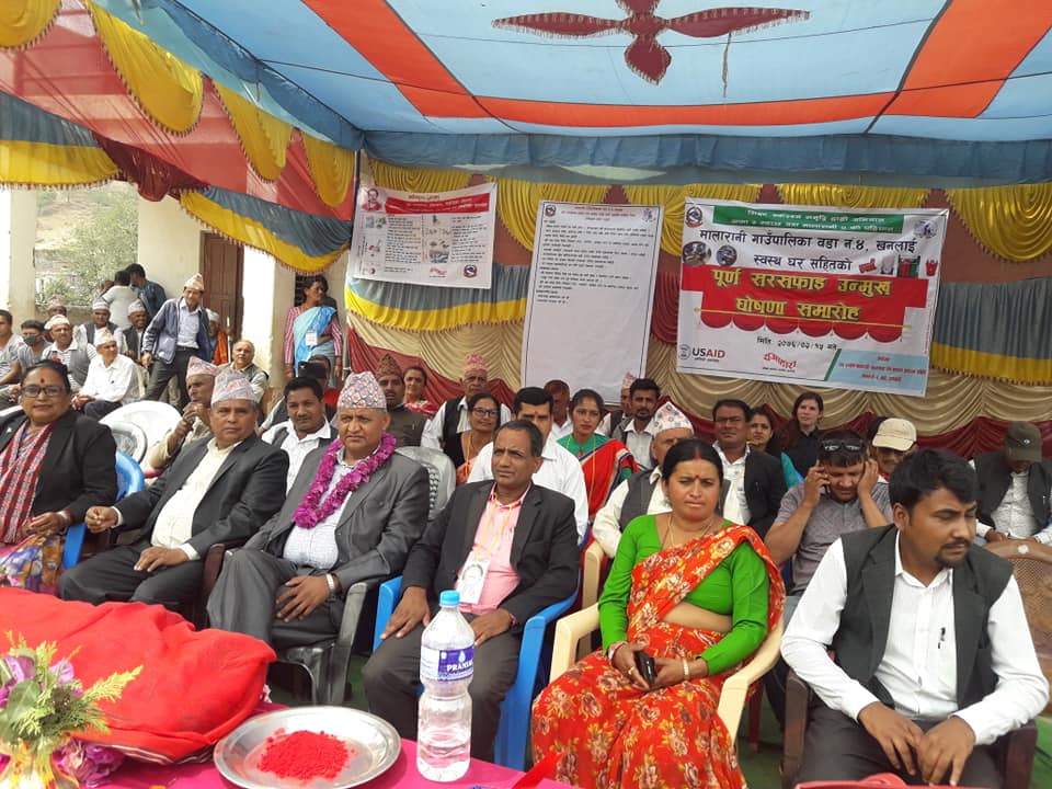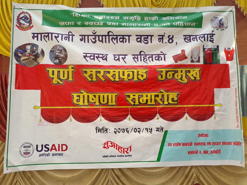 कार्यक्रममा बाेल्दै उहाँले प्रदेश सरकारले ल्यायका जनमुखि कार्यक्रम बिषयका प्रकाश पार्नुभएकाे थियाे । वडास्तरीय खानेपानी सरसफाइ तथा स्वच्छता समन्वय समिति मालारानी ४ काे पहल लुम्विनि सामाजिक विकास केन्द्रका सहजिकरण सुहाराकाे प्राविधिक सहयाेगमा ४ नं.वडा पूर्ण सरसफाइ उन्मुख घाेषणा गरियकाे हाे ।
