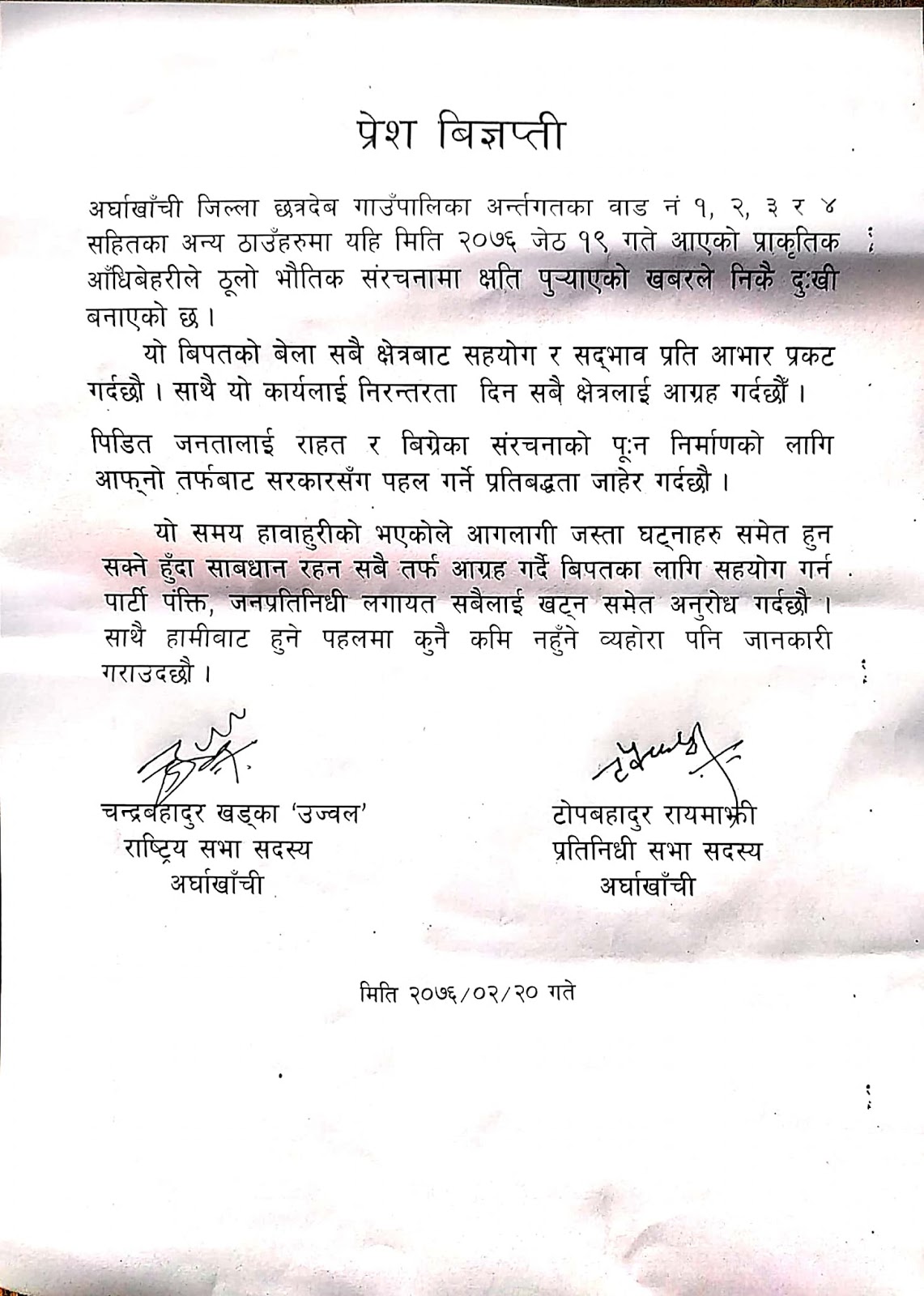 छत्रदेवमा हावाहुरीले भौतिक संरचनामा पुर्याएको क्षती प्रति कांग्रेस अर्घाखाँचीद्वारा दु:ख ब्यक्त (प्रेस विज्ञप्ति सहित)