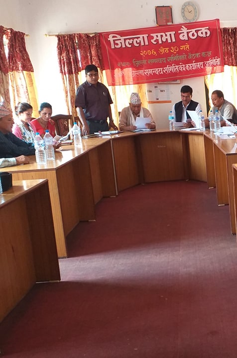 यस्तै जिल्ला समन्वय समितिका समन्वय अधिकारी एवं जिल्ला सभा सदस्य सचिब जगनाथ पन्तले जिल्ला सभाका एजेण्डाहरु प्रस्तुत गदै स्थानीय सरकारको रुपमा रहेका गाँउपालिका र नगरपालिकालाई नेपालको संविधानले प्रदान गरेका एकल अधिकारका विषय क्षेत्रमा आबश्यक कानुनको मस्यौदा गर्न जिल्ला समन्वय समितिको कार्यालयमा रहेका कानुन मस्यौदा कर्मचारीको पूर्ण सहयोग लिन आग्रह गर्नुभयो ।