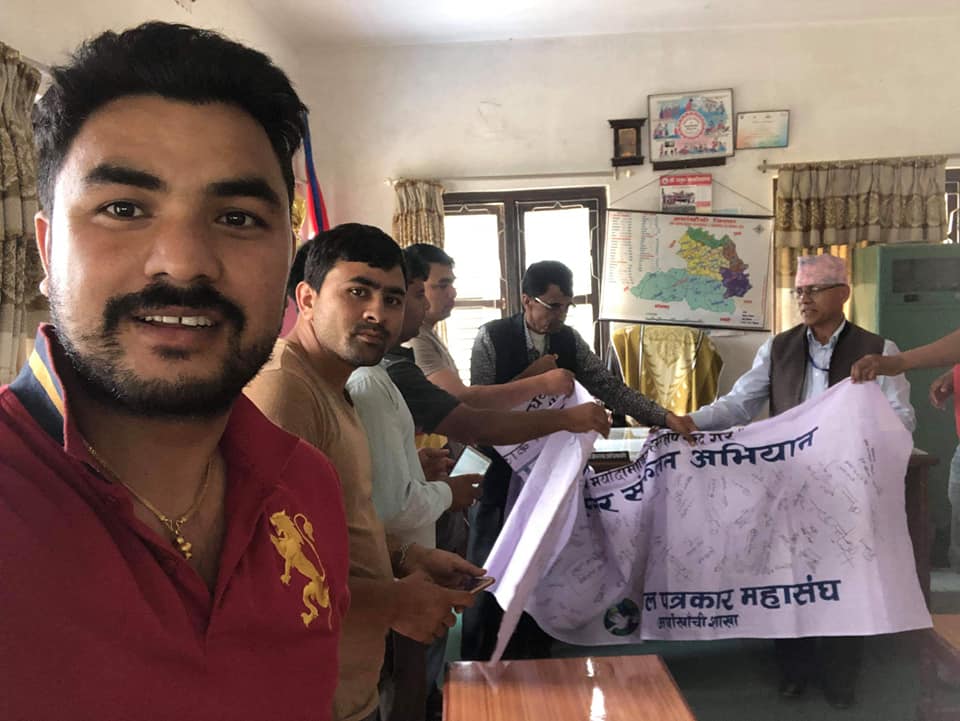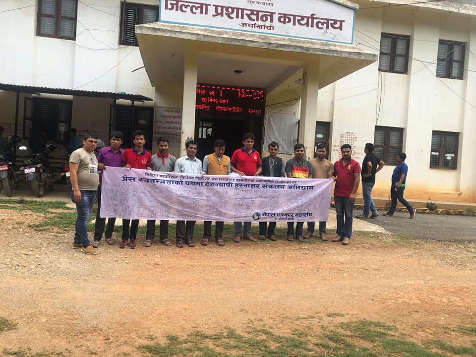 मिडिया काउन्सिल बिधेयककाे बिरूद्द र पूर्ण प्रेस स्वतन्त्रताको पक्षमा ३ गते देखि संकलन गरिएकाे हस्ताक्षर प्रमुख जिल्ला अधिकारी मार्फत प्रधानमन्त्री तथा मन्त्री परिषदकाे कार्यलयमा पठाइएको हो ।