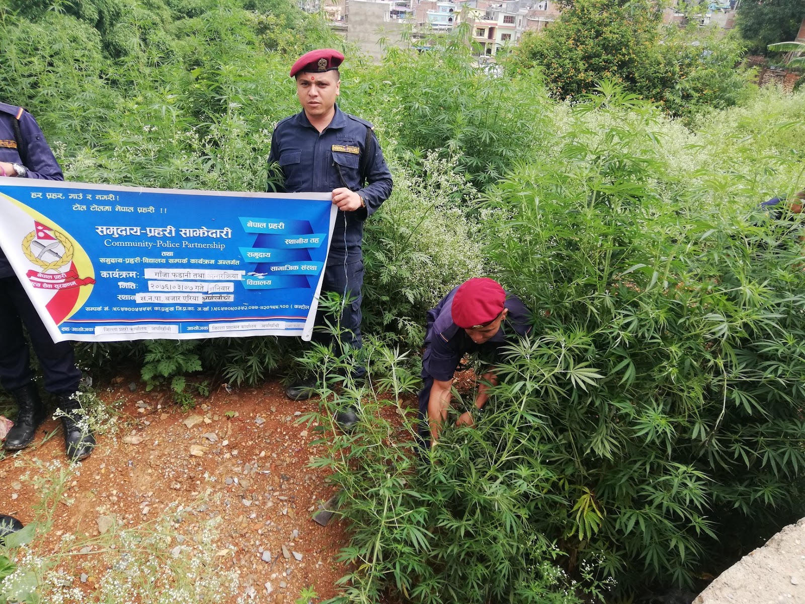 जिल्ला कार्यालयबाट प्र.ना.नि. भिमार्जुन अधिकारीको कमाण्डमा खटिएको १८ जनाको प्रहरी टोलीले “समुदाय-प्रहरी साझेदारी कार्यक्रम” अनुसार गृह मन्त्रालयको लागु औषध नियन्त्रणको साप्ताह व्यापी कार्यक्रम अन्तर्गतको तेस्रो दिन जिल्ला प्रहरी कार्यालय अर्घाखाँचीको आयोजनामा सन्धिखर्क नगरपालीका वडा नं. १ र २ को शान्ती बगैचा देखि मिडिया चोक सम्मको बजार एरियाको सार्वजनिक स्थानमा प्राकृतिक रुपमा आफै उम्रिएका गाँजा फडानी कार्यक्रम सम्पन्न भएको हो ।