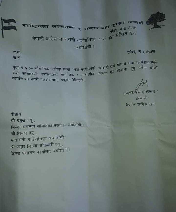 ध्यानाकर्षणपत्र नेपाली कांग्रेस मालारानी सभापति शोभाखर खनाल, महाधिवेशन प्रतिनिधी तथा मालारानी-४ का इन्चार्ज कृष्ण खनाल लगायतका नेताहरुको उपस्थितिमा वडा अध्यक्षलाइ बुझाएका हुन । ध्यानाकर्षण पत्र बुझाएपछि नेपाली कांग्रेस मालारानीका सभापति शोभाखर खनाल, कृष्ण खनाल लगायतका नेताहरुले कार्यकर्तालाइ सम्बोधन पनी गरेका थिए । मालारानीमा जनप्रतिनिधीले नभई नेकपाले रजाई गरेको उनीहरुको भनाई छ ।