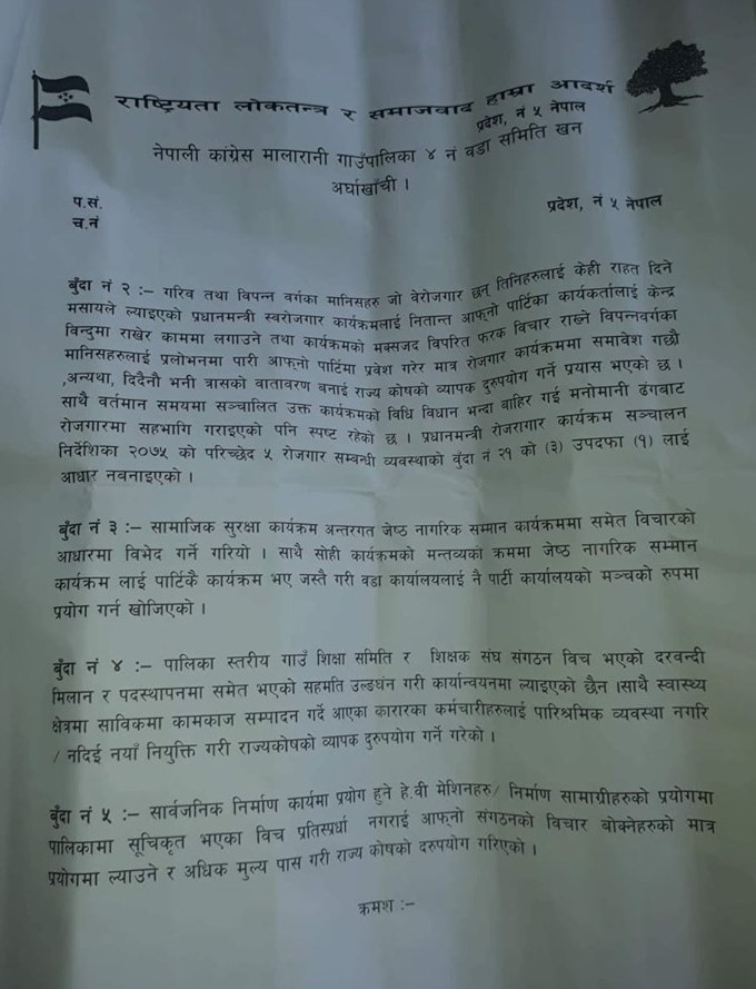 प्रधानमन्त्री स्वरोजगार कार्यक्रममा कार्यकर्ता भर्ती गरेको, सामाजिक सुरक्षा कार्यक्रमको ज्येष्ठ नागरिक सम्मान कार्यक्रममा पनि राजनिती गरेका नेकपाका ज्येष्ठ नागरिक बोलाएर कांग्रेसका ज्येष्ठ नागरिकलाइ कार्यक्रमबाट बञ्चित गरेको ध्यानाकर्षण पत्रमा उल्लेख गरिएको छ । मालारानी गाँउपालिकाको वडा नम्बर-४ खनमा भएको अनियमितता तत्काल बन्द गर्न नेपाली कांग्रेसले माग गरेको छ ।