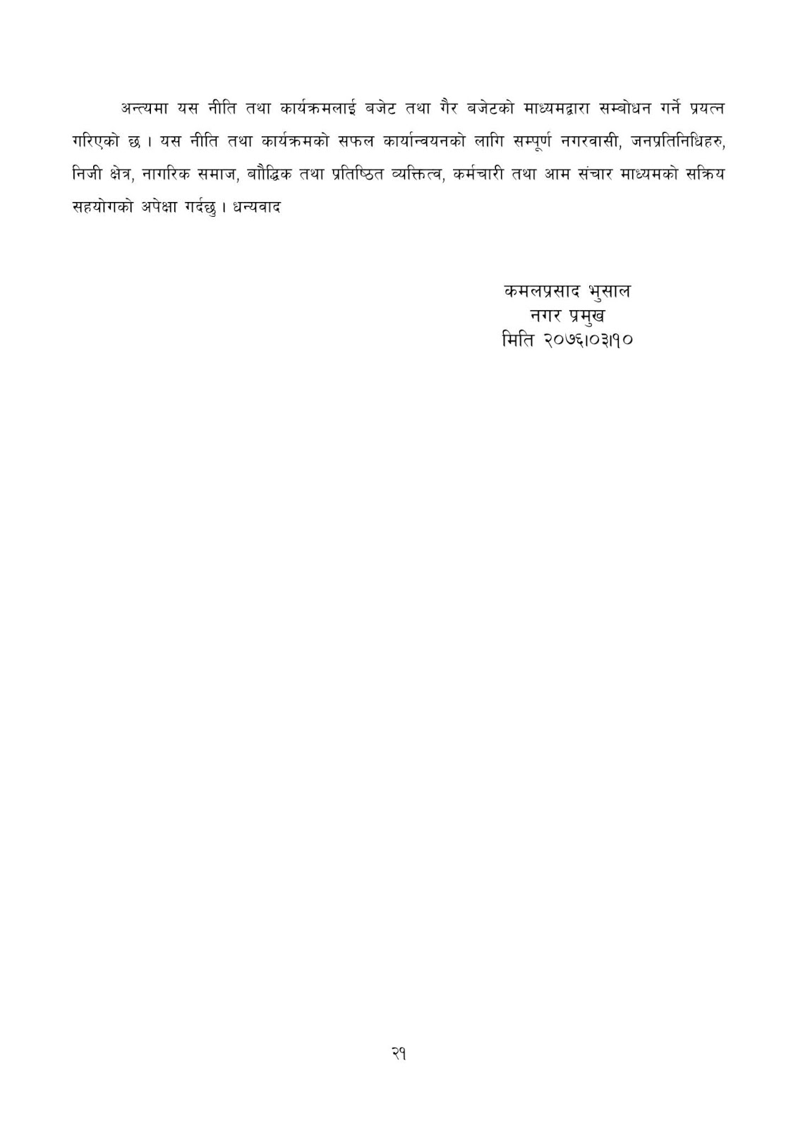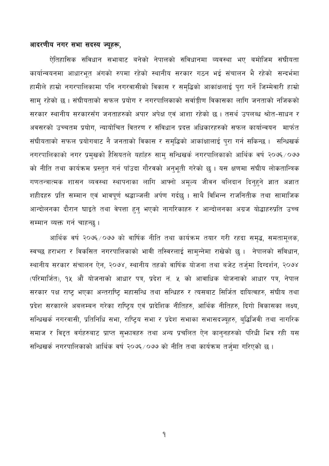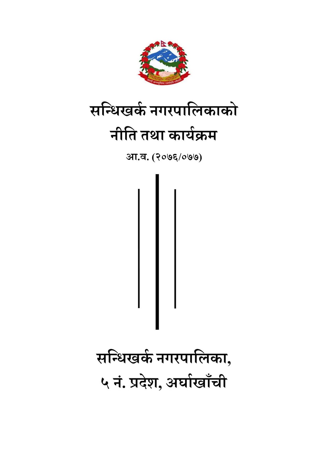 आर्थिक बर्ष २०७६/२०७७ का लागि नीति तथा कार्यक्रम नगरप्रमुख कमल प्रसाद भुसालले पेश गर्नु भएको छ । नगरपालिका को पाचौं नगरसभामा नगरप्रमुख भुसालले २१ पेज लामो नगरपालिकाको भाग्य रेखा नीति कार्यक्रम पेस गरेपछि नगरसभाले सर्बसहमत पारित समेत गरेको छ । नगरप्रमुख भुसालले पेस गरेको नीति तथा कार्यक्रममा दिर्घकालिन योजनाहरु समाबेस गरिएको छ । निति तथा कार्यक्रमको पुर्ण पाठ:-