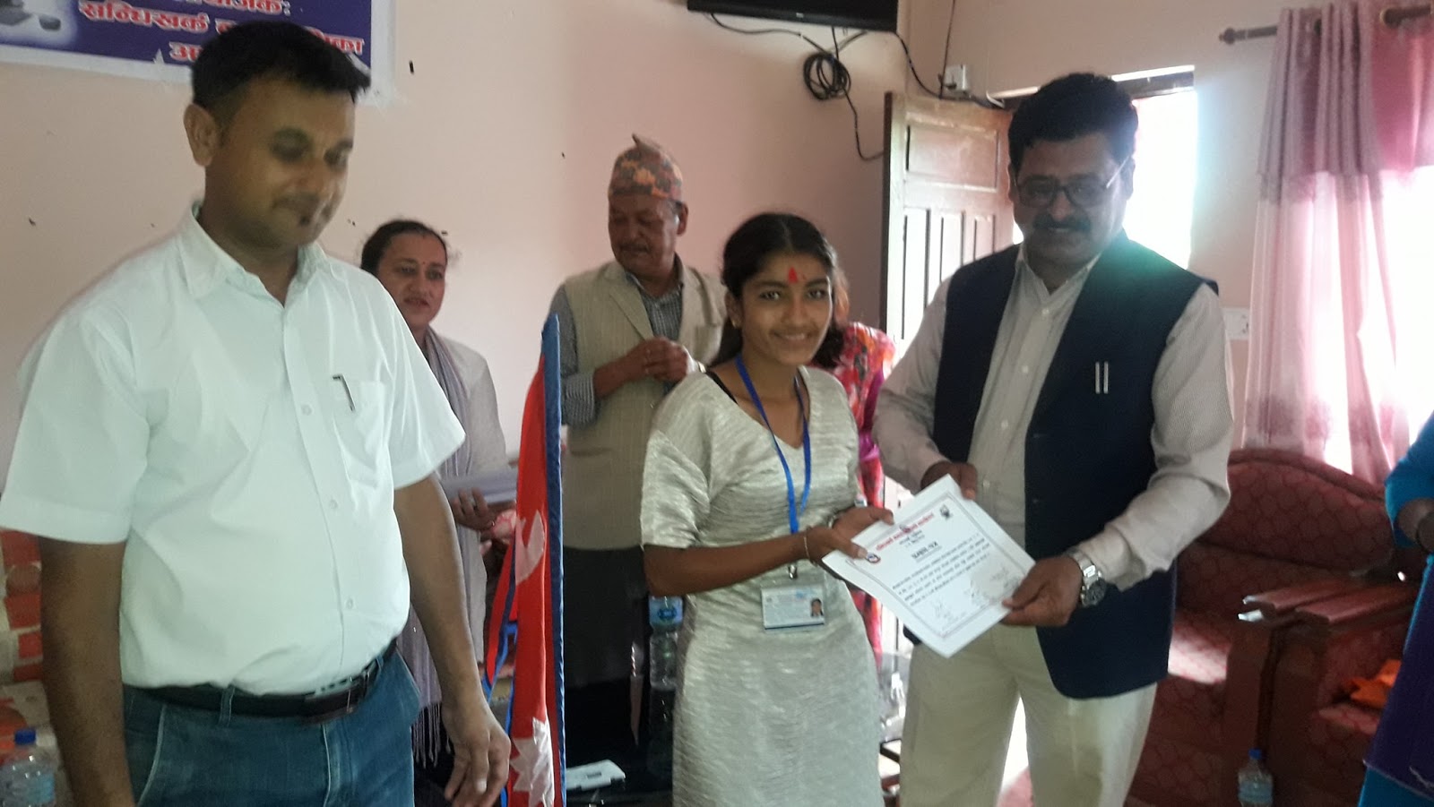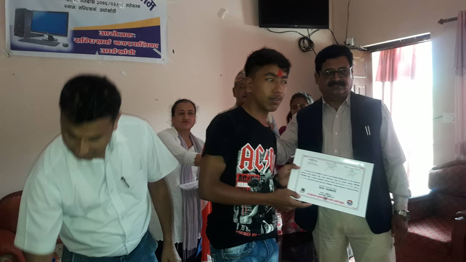 सन्धिखर्क नगरपालिकाले सन्चालन गरेको दलित मुस्लिम युवा युवतीहरुका लागि आयोजना गरेको ३ महिने नि:शुल्क कम्प्युटर तालिमको समापन गर्दै नगरप्रमुख भुसालले ३ महिना सम्म तालिम लिएपछि त्यसलाई निरन्तरता दिन आग्रह गर्नु भयो ।