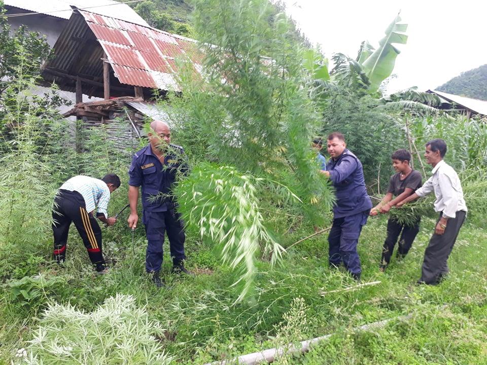 प्रहरी चौकी खिल्जीबाट प्र.ना.नि.देव बहादुर के.सि.को कमाण्डमा खटिएको प्रहरी टोली र स्थानियहरुको उपस्थिमा “समुदाय-प्रहरी साझेदारी कार्यक्रम” अनुसार भुमिकास्थान नगरपालीका वडा नं.६ स्थित दुर्वाङमा प्राकृतिक रुपमा उम्रिएका अन्दाजी ९० गाँजाका वोटहरु नष्ट गरिएको हो ।