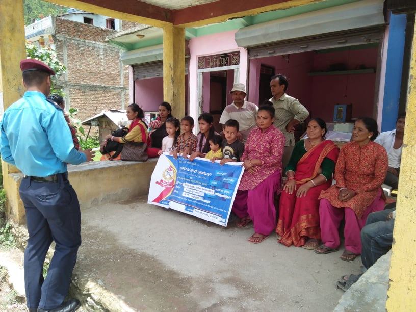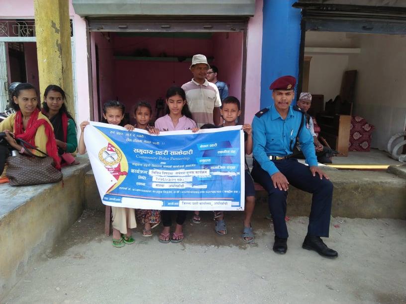 जिल्ला प्रहरी कार्यालय अर्घाखाँचीको आयोजनमा “समुदाय-प्रहरी साझेदारी कार्यक्रम” अन्तर्गत फुदवाङमा स्थानियबासी , भद्रभलादमी, समाजसेवी, बुद्धिजिवि, महिला, युवा र बालबालिकाको उपस्थितिमा प्र.स.नि. सन्तोष के.सी.ले वाढी पहिरोबाट बच्ने उपाय तथा जंगली च्याउ नखाने सम्बन्धी बिबिध बिषयमा छलफल तथा अन्तरक्रिया गर्नु भएको थियो ।