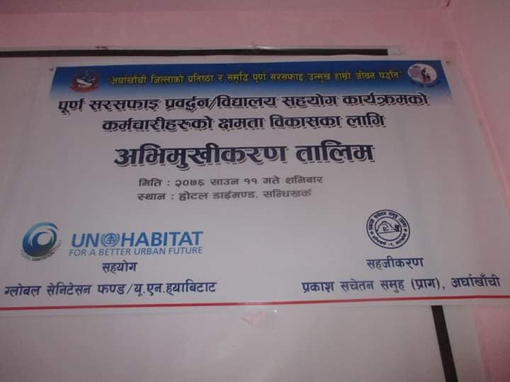 ग्लोबल सेनिटेसन फण्ड/यू.एन. ह्याबिटाट को सहयोग र प्रकाश सचेतन समूह (प्राग)को सहजीकरणमा सनिश्चवार  सन्धिखर्कमा पूर्ण सरसफाइ प्रबर्द्धन /विद्यालय सहयोग कार्यक्रमको कर्मचारीहरूको क्षमता बिकासका लागि राखिएको अभिमुखीकरण तालिममा बोल्ने बक्ताहरुले पूर्ण सरसफाइमा जोड दिएका हुन्। साथै सरसफाइमा सबै लागि पर्न अावश्यक भएकाे बताएका छन्।
